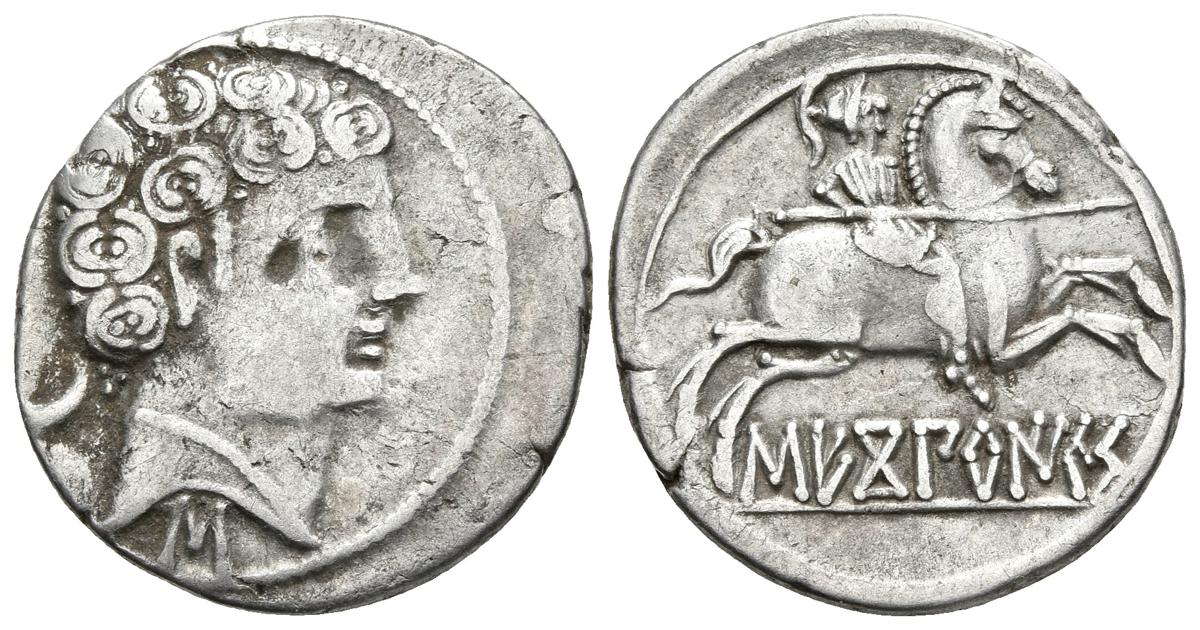 SECOBIRICES. Denario. 120-30 a.C. Saelices (Cuenca). A/ Cabeza masculina a derecha con torque simple, detrás creciente y debajo letra ibérica S. (Tres puntos en la nuca, seis líneas entre rizos y ocho rizos) R/ Jinete con lanza a derecha, debajo SECoBiRICeS. FAB-2171. Ar. 3,87g. MBC/MBC+.