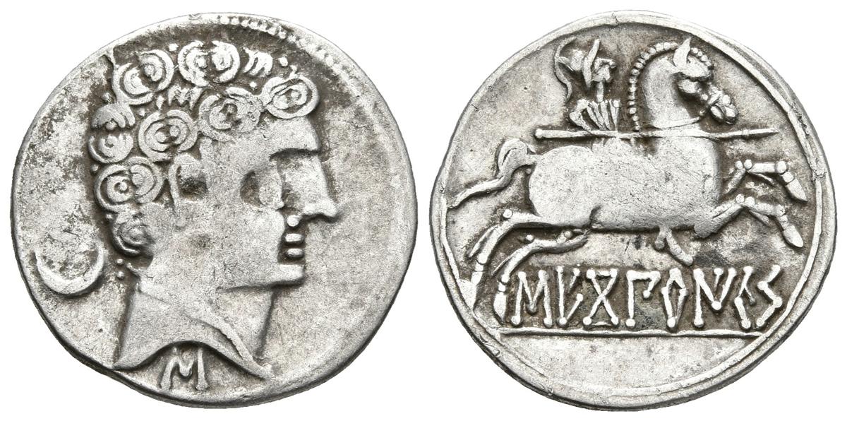 SECOBIRICES. Denario. 120-30 a.C. Saelices (Cuenca). A/ Cabeza masculina a derecha con torque simple, detrás creciente y debajo letra ibérica S. (Tres puntos en la nuca, cuatro líneas entre rizos y ocho rizos) R/ Jinete con lanza a derecha, debajo SECoBiRICeS. FAB-2171. Ar. 3,50g. MBC+/MBC.