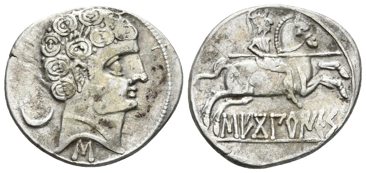 SECOBIRICES. Denario. 120-30 a.C. Saelices (Cuenca). A/ Cabeza masculina a derecha con torque simple, detrás creciente y debajo letra ibérica S. (Cinco líneas entre rizos y ocho rizos) R/ Jinete con lanza a derecha, debajo SECoBiRICeS. FAB-2168. Ar. 3,33g. MBC+.
