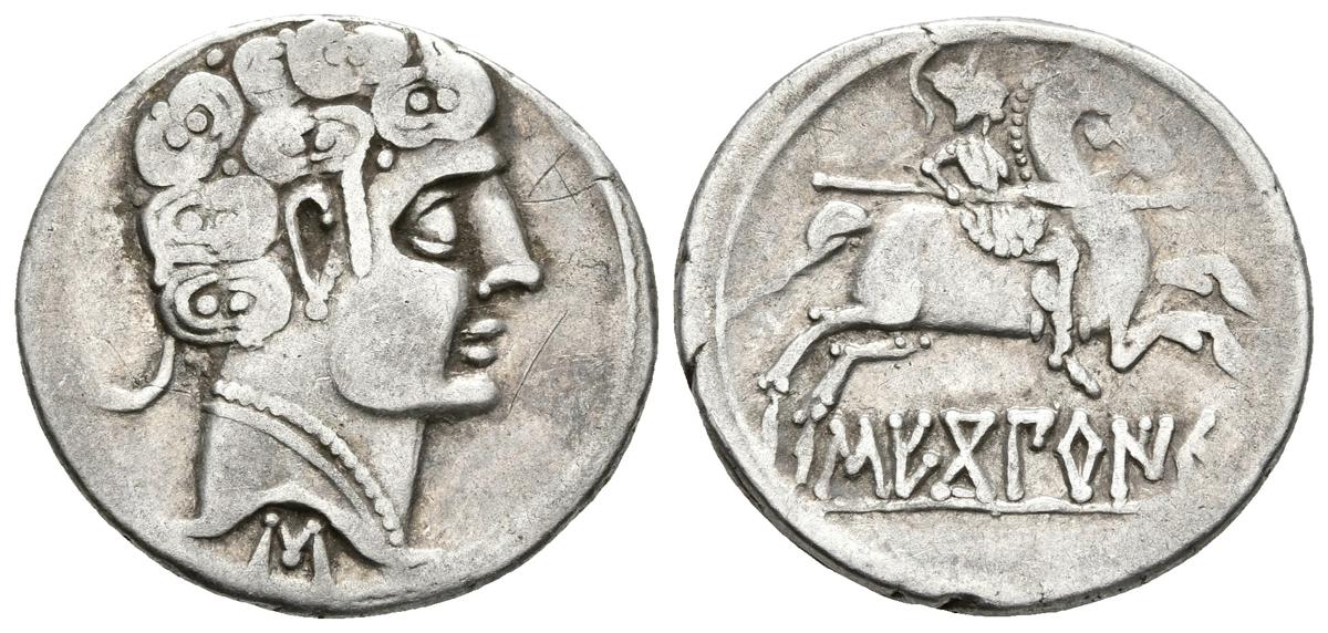 SECOBIRICES. Denario. 120-30 a.C. Saelices (Cuenca). A/ Cabeza masculina a derecha con torque doble, detrás creciente y debajo letra ibérica S. (Dos puntos en la nuca). R/ Jinete con lanza a derecha, debajo SECoBiRICeS. FAB-2170. Ar. 3,89g. MBC.