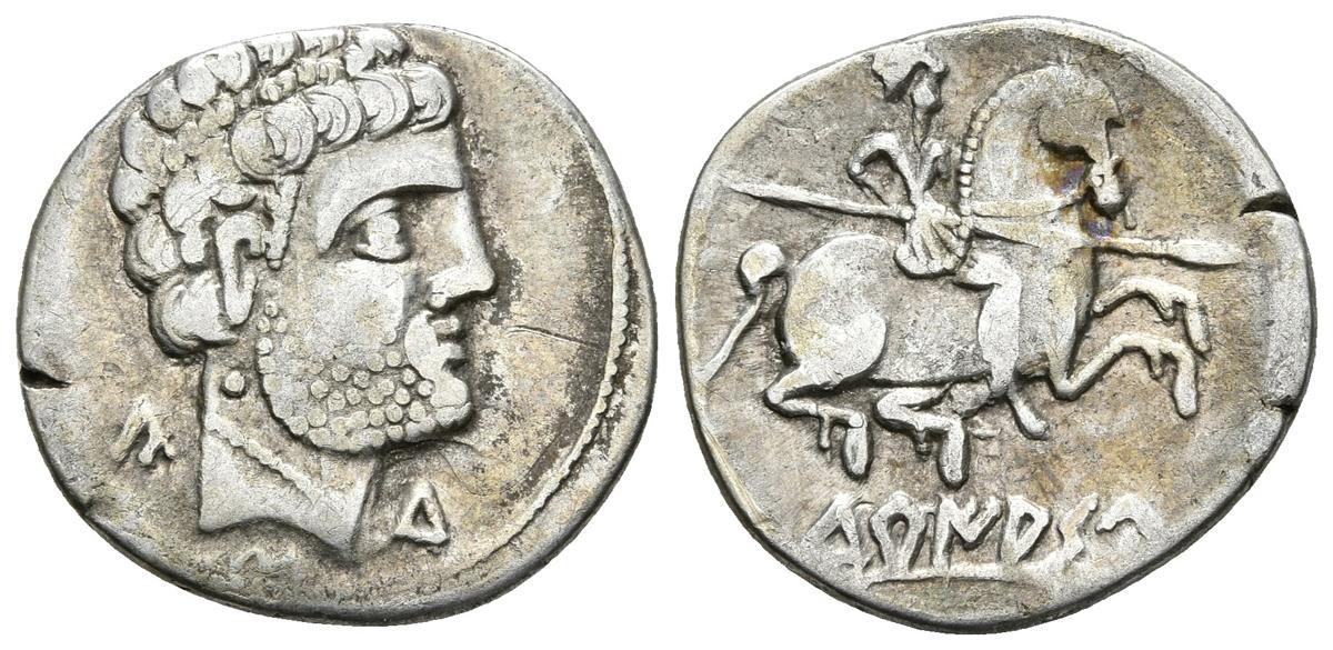 TURIASO. Denario. 120-80 a.C. Tarazona (Zaragoza). A/ Cabeza masculina a derecha con torque simple y letras ibéricas Ca.S.Tu. (Marca de punto detrás de la mandíbula). R/ Jinete con lanza a derecha, debajo TuRIASU. FAB-2417. Ar. 3,15g. MBC-/MBC. ¿Inedita? Muy rara.