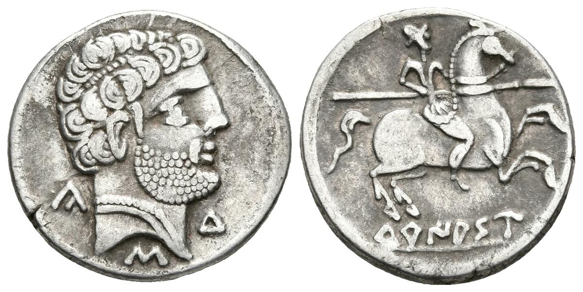 TURIASO. Denario. 120-80 a.C. Tarazona (Zaragoza). A/ Cabeza masculina a derecha con torque doble y letras ibéricas Ca.S.Tu. (Siete puntos entre los rizos). R/ Jinete con lanza a derecha, debajo TuRIASU. FAB-2417. Ar. 3,93g. MBC+.