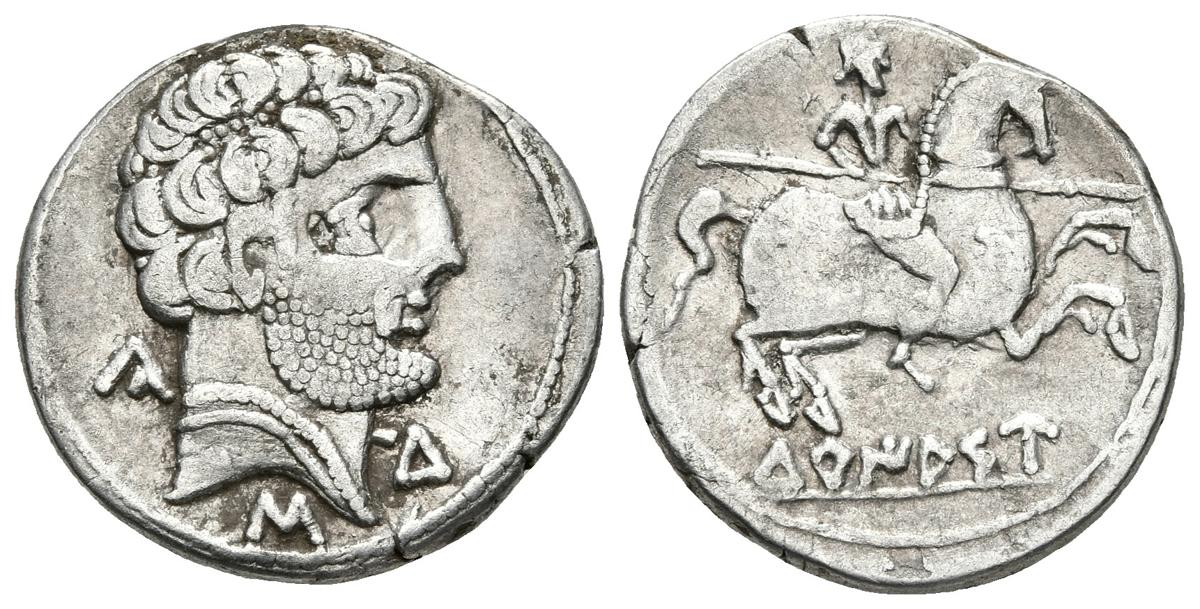 TURIASO. Denario. 120-80 a.C. Tarazona (Zaragoza). A/ Cabeza masculina a derecha con torque doble y letras ibéricas Ca.S.Tu. (Seis puntos entre los rizos y marca junto a la letra Tu.) R/ Jinete con lanza a derecha, debajo TuRIASU. FAB-2417. Ar. 3,44g. MBC. Escasa.