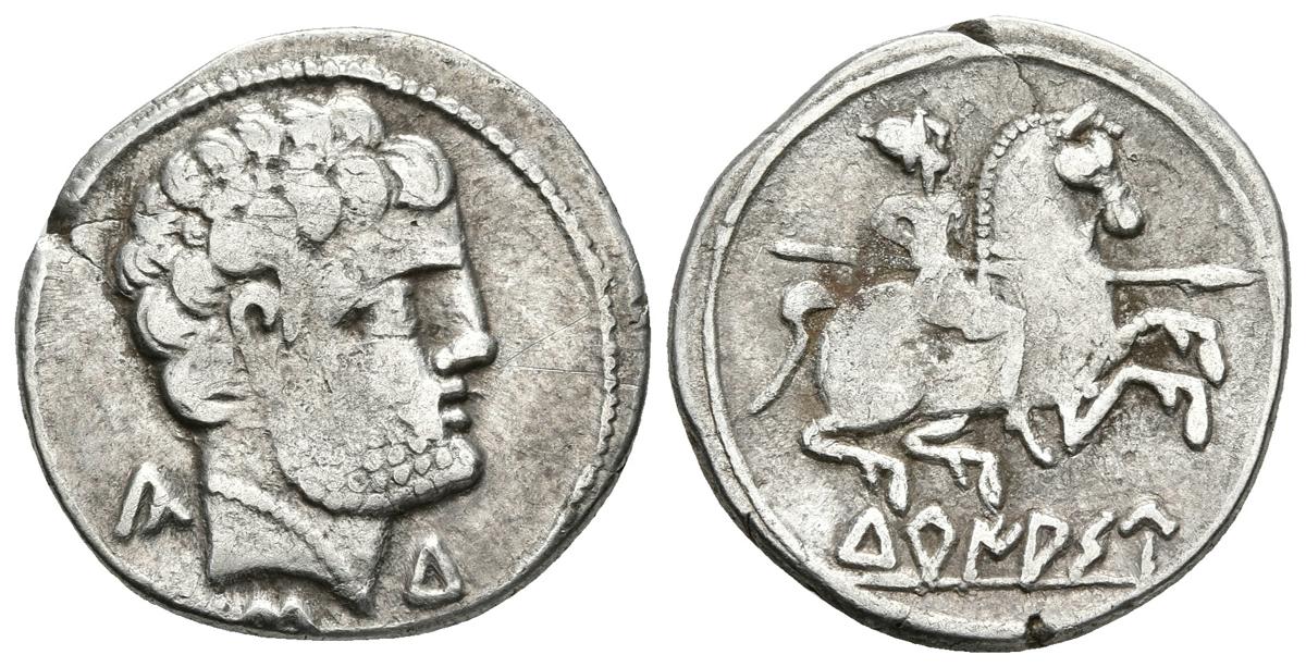 TURIASO. Denario. 120-80 a.C. Tarazona (Zaragoza). A/ Cabeza masculina a derecha con torque simple y letras ibéricas Ca.S.Tu. R/ Jinete con lanza a derecha, debajo TuRIASU. FAB-2417. Ar. 3,90g. MBC-.