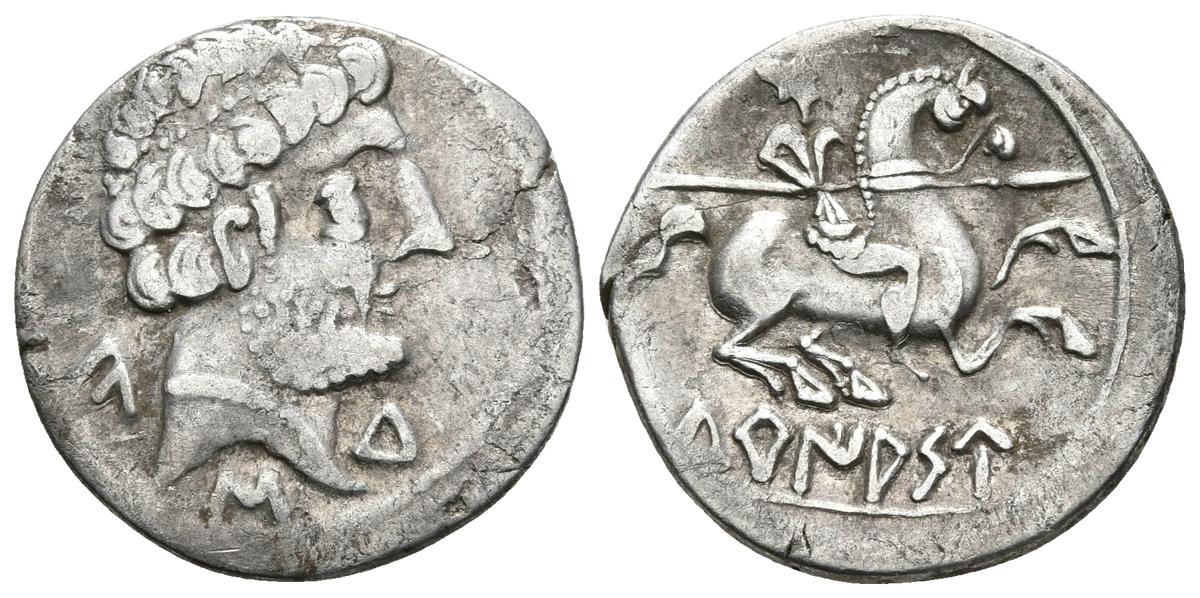 TURIASO. Denario. 120-80 a.C. Tarazona (Zaragoza). A/ Cabeza masculina a derecha con torque simple y letras ibéricas Ca.S.Tu. (Seis puntos entre los rizos) R/ Jinete con lanza a derecha, debajo TuRIASU. FAB-2417. Ar. 3,16g. MBC-/MBC+.