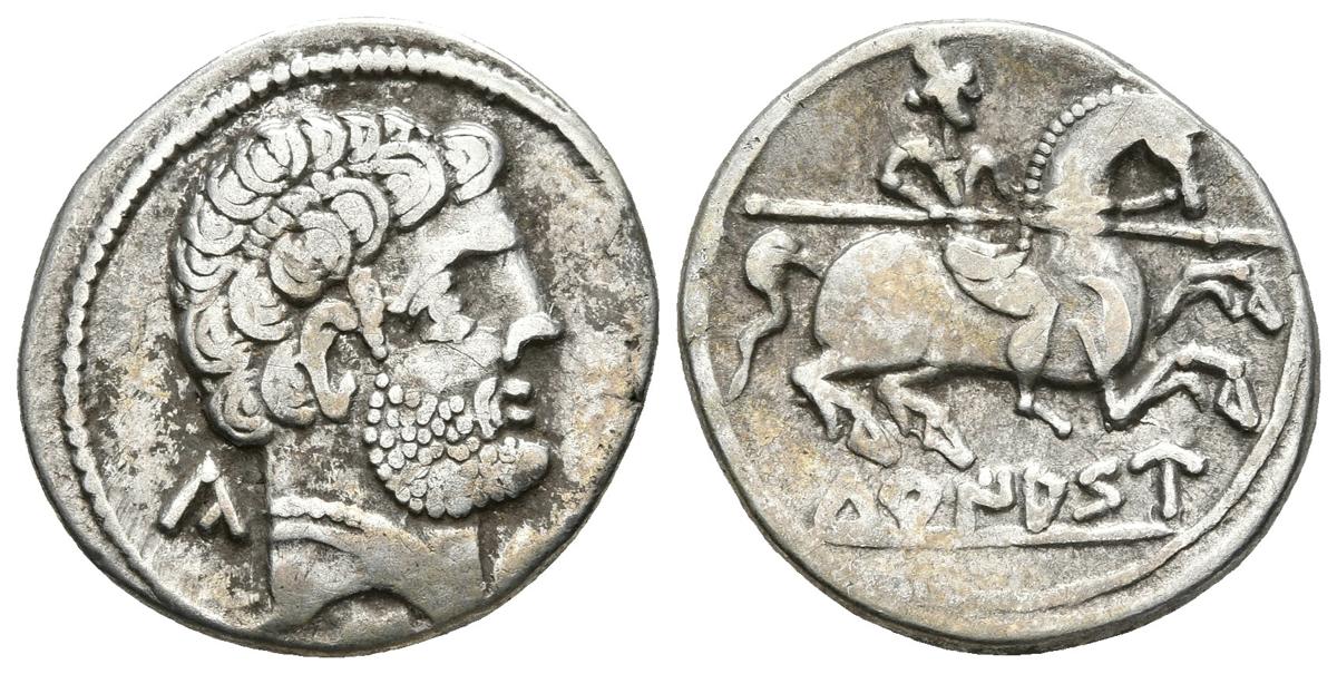 TURIASO. Denario. 120-80 a.C. Tarazona (Zaragoza). A/ Cabeza masculina a derecha con torque doble y letras ibéricas Ca.S.Tu. (Siete líneas punto entre los rizos) R/ Jinete con lanza a derecha, debajo TuRIASU. FAB-2417. Ar. 3,64g. MBC.