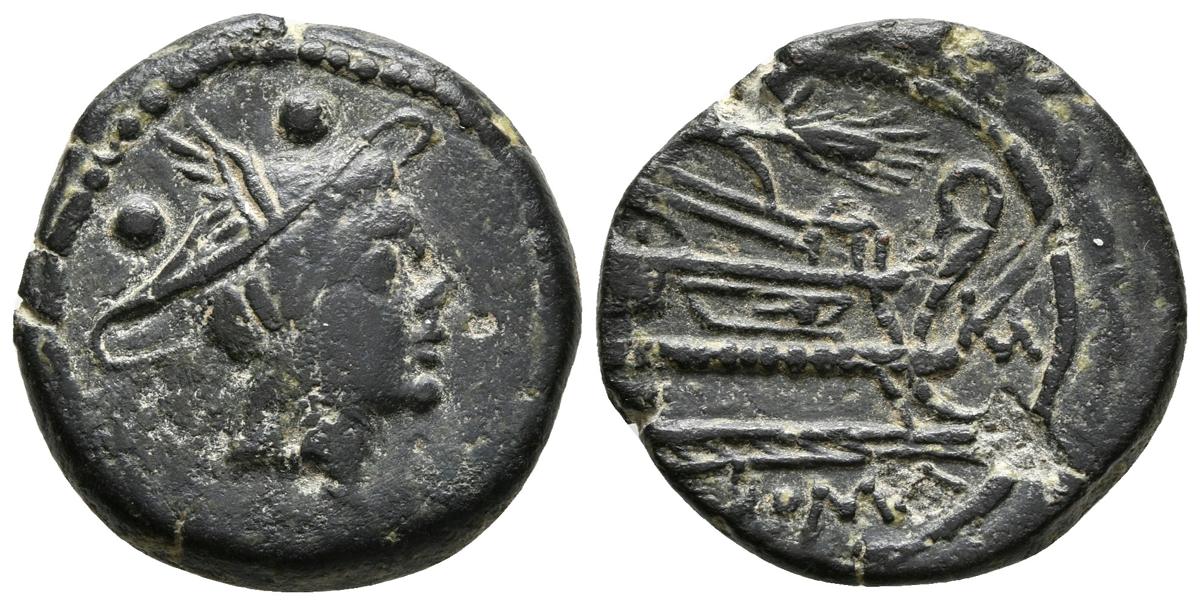 ACUÑACIONES ANONIMAS. Sextans. 207-206 a.C. Sicilia. A/ Cabeza de Mercurio con petasus a derecha, sobre el dos puntos. R/ Proa a derecha, sobre ella espiga con granos, delante monograma KA y debajo ROMA. Craw 69.6a. RBW 293. Sydenham 310d. Ae. 6,56g. MBC/MBC+.