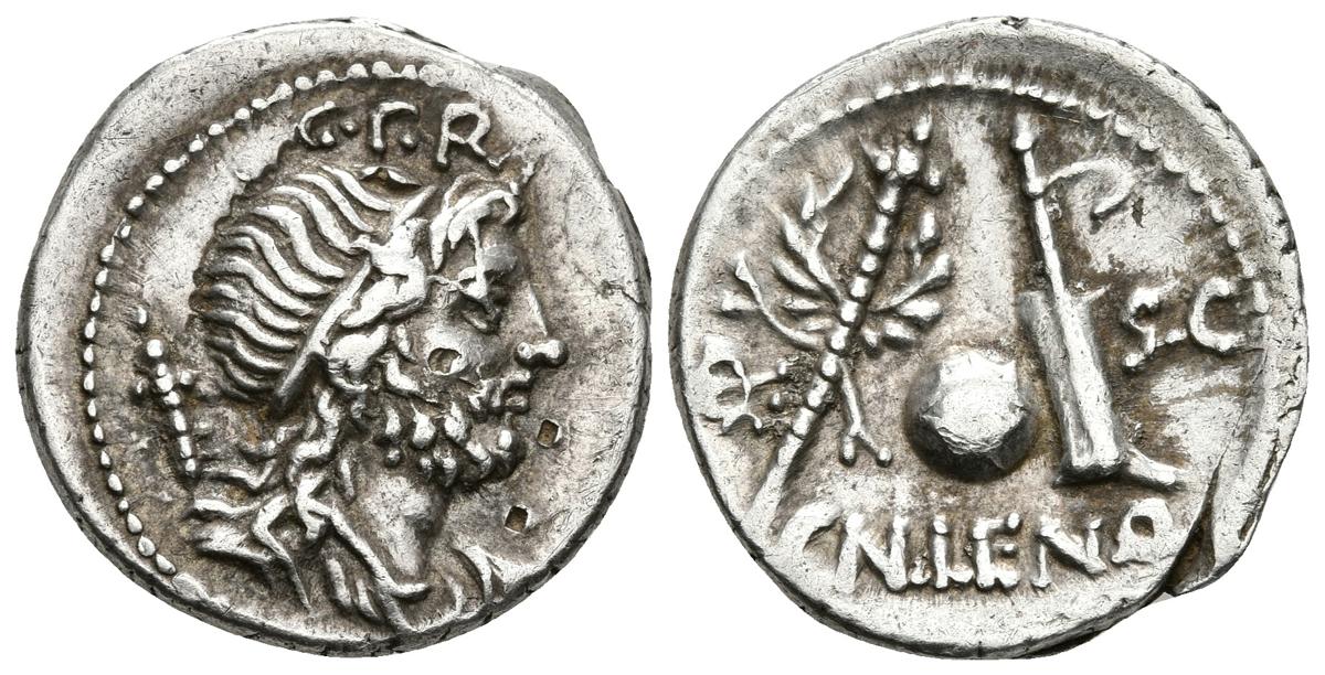 CN. CORNELIUS LENTULUS. Denario. 76-75 a.C. Hispania. A/ Busto drapeado con diadema de Genio Populi Romani a derecha, detrás cetro y encima G·P·R. R/ Cetro rematado en corona, globo y timón los lados EX–SC y debajo CN·LENT CVR UFL. Craw 393.1b. Ar. 3,94g. Pequeñas marcas de banquero en anverso EBC-.