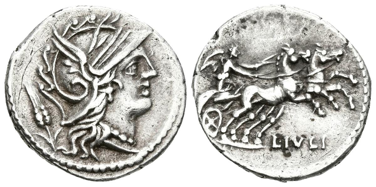 L. JULIUS. Denario. 101 a.C. Roma A/ Cabeza de Roma a derecha, detrás espiga. R/ Victoria en biga a derecha, debajo L.IULI. Craw 323.1. Ar. 3,93g. Rayitas por limpieza. MBC+.
