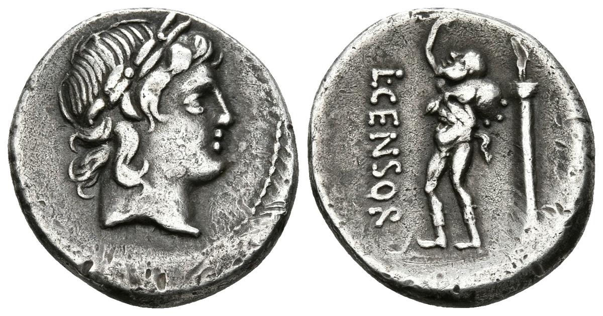 L. MARCIUS CENSORIUS. Denario. 82 a.C. Roma. A/ Cabeza de Apolo laureado a derecha. R/ Sátiro Marsyas a izquierda con el brazo derecho levantado y sobre el hombro izquierdo sosteniendo piel con vino, a su izquierda columna rematada en victoria, delante L·CENSOR. Craw 363.1d. Ar. 3,97g. MBC+. Ex. Aureo & Calicó 314.