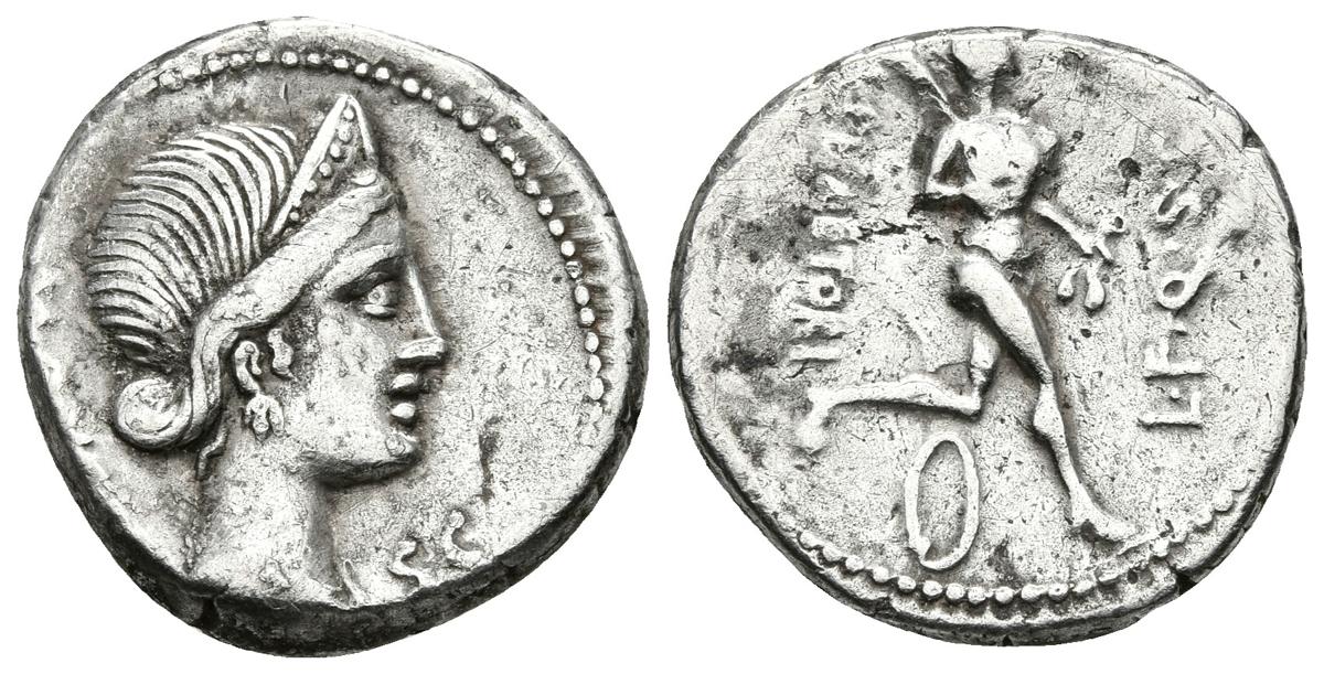 L. PLAETORIUS L. F. CESTIANUS. Denario. 67 a.C. Roma. A/ Busto drapeado con diadema de Juno Moneta a derecha, detrás MONETA y delante S·C. R/ Atleta corriendo a derecha con palma y cesto, delante L. F. Q. S. C. y detrás L. PLAETORI, debajo aro. Craw 396.1b. Ar. 3,96g. MBC+/MBC. Escaso.