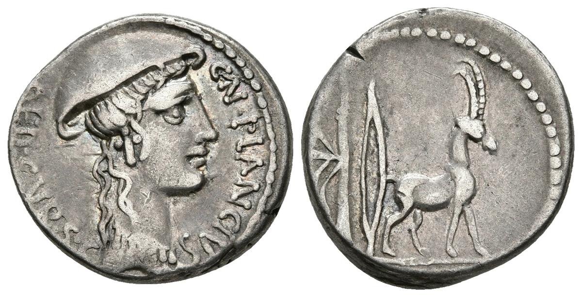 CN. PLANCIUS. Denario. 55 a.C. Roma. A/ Busto de Diana Planciana a derecha con petasus. CN PLANCIUS AED CUR SC. R/ Cabra a derecha, detrás carcaj y arco. Craw 432.1. Ar. 4,01g. MBC+.