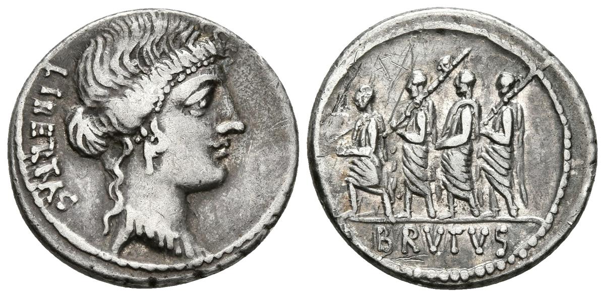 Q. SERVILIUS CAEPIO (M. JUNIUS) BRUTUS. Denario. 54 a.C. Roma. A/ Busto de Libertas a derecha, detrás LIBERTAS. R/ Cónsul L. Junius Brutus, marchando entre dos lictores y precedido por un accensus, en exergo BRVTVS. Craw 433.1. Ar. 3,96g. Rayitas en reverso. MBC+.