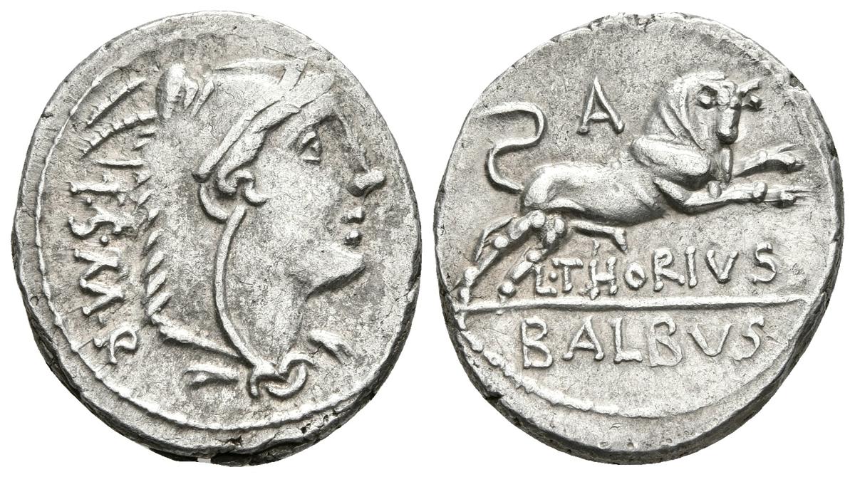 L. THORIUS BALBUS. Denario. 105 a.C. Roma. A/ Busto de Juno Sospita a derecha, cubierta con piel de cabra, detrás I·S·M·R. R/ Toro a derecha con las patas delanteras levantadas, encima A y debajo L.THORIUS, en el exergo BALBUS. Craw 316.1. Ar. 4,08g. EBC.