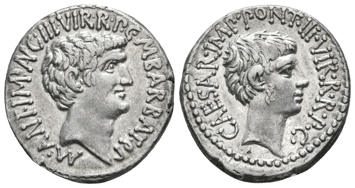 MARCO ANTONIO Y OCTAVIO. Denario. 41 a.C. Ceca móvil junto a Marco Antonio (¿Ephesos?). A/ Cabeza de Marco Antonio a derecha. M•ANT•IMP•AVG•III•VIR•R•P•C•M•BARBAT•Q•P. R/ Cabeza de Octavio a derecha. CAESAR•IMP•PONT•III•VIR•R•P•C•. Craw 517.2; CRI 243; RSC 8a. Ar. 3,82g. EBC.