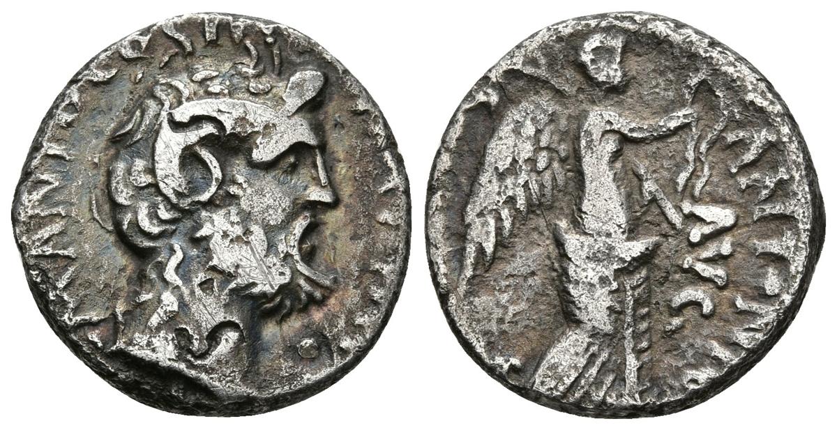 MARCO ANTONIO & L. PINARIUS SCARPUS. Denario. 31 a.C. Cyrene. A/ Júpiter Ammon a derecha, delante del mentón punto. M. ANTO. COS III IMP IIII. R/ Victoria a derecha portando corona y palma. ANTONIO AVG - SCARPVS IMP. Sear 390; Craw 546/2a; Sydenham 1280. Ar. 3,28g. Bonito tono. MBC+/MBC. Muy rara. Lucius Pinarius Scarpus era el nieto de una hermana de Julio César, y un general de Antonio en la guerra contra Bruto y Casio. Poco antes de la batalla de Actium, fue puesto a cargo de Cirene con el mando de cuatro legiones. El tipo anverso se refiere a su nueva posición ya que Zeus era la deidad principal de Cirene y se destacó en su antigua acuñación.
