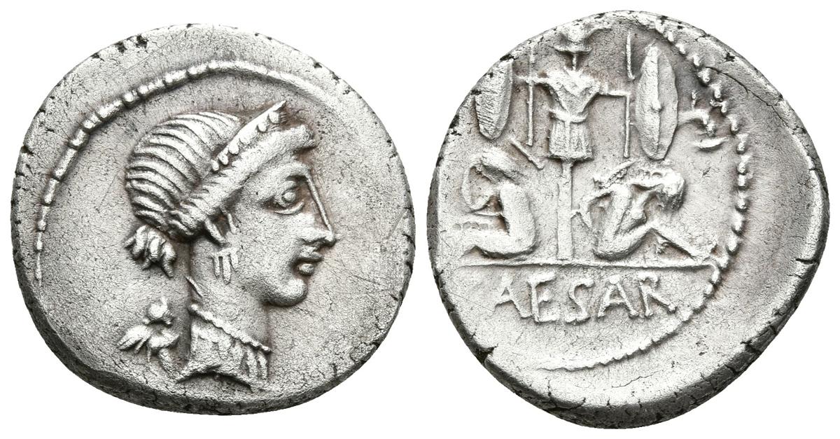 JULIO CESAR. Denario. 46-45 a.C. Ceca militar móvil acompañando a Julio César (España). A/ Cabeza de Venus con stephane a derecha, detrás cupido. R/ Trofeo de armas galas entre dos cautivos sentados, en exergo CAESAR. Craw 468.1; CRI 58; RSC 13. Ar. 4,18g. MBC+.