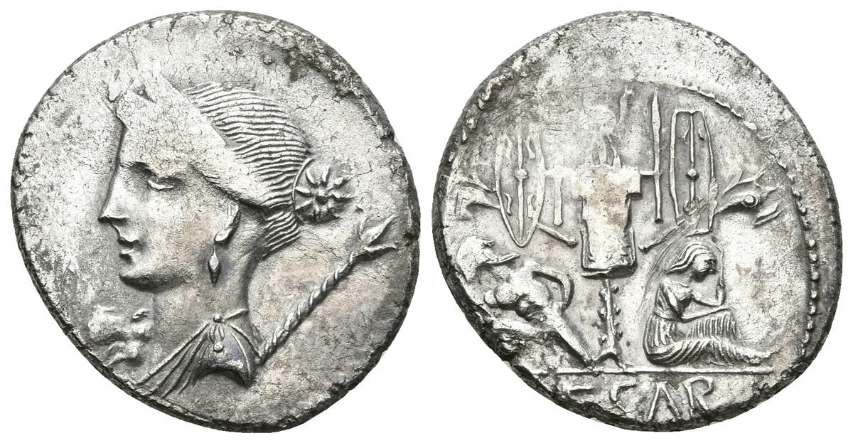 JULIO CESAR. Denario. 46-45 a.C. Ceca militar móvil (Hispania). A/ Busto drapeado de Venus a izquierda, delante lituus y busto de cupido, detrás cetro. R/ Trofeo de armas galas entre dos cautivos sentados, en exergo CAESAR. Craw 468.2; CRI 59; Sy 1015; BMCRR Spain 86-8; RSC 14. Ar. 3,27g. MBC+.