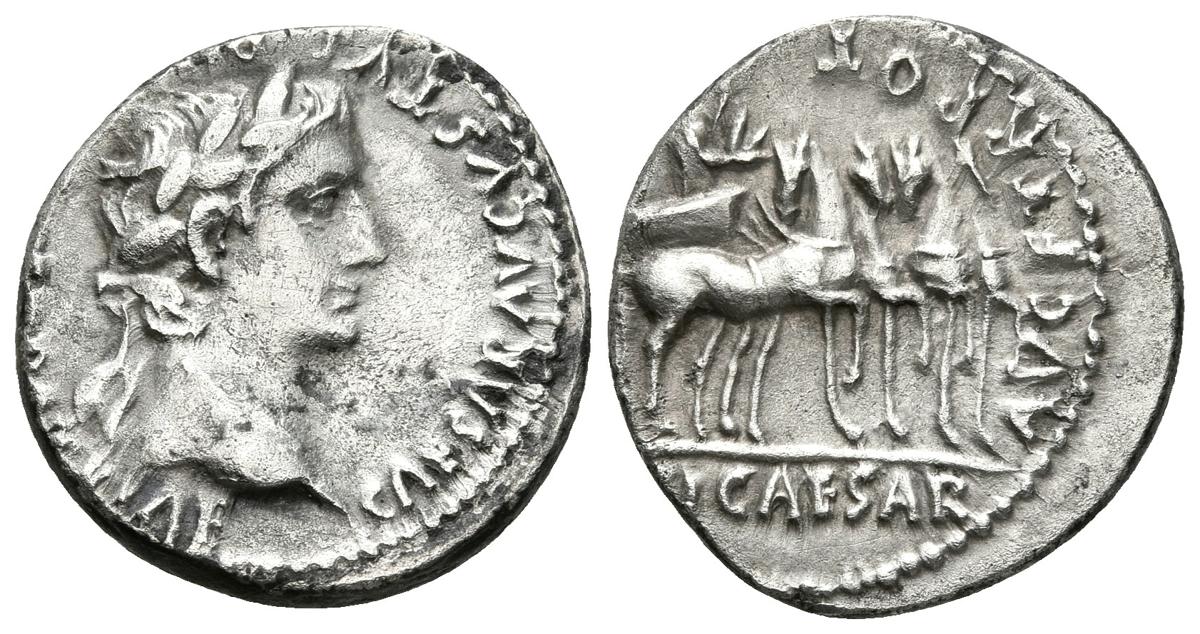 AUGUSTO. Denario. 24 a.C.-14 d.C. Lugdunum. A/ Cabeza laureada a derecha. CAESAR AVGVSTVS DIVI F PATER PATRIAE. R/ Tiberio guiando cuádriga triunfal a derecha, sosteniendo rama y cetro rematado con un águila. RIC 222; Lyon 92; RSC 301. Ar. 3,65g. MBC+/EBC-. Escasa.