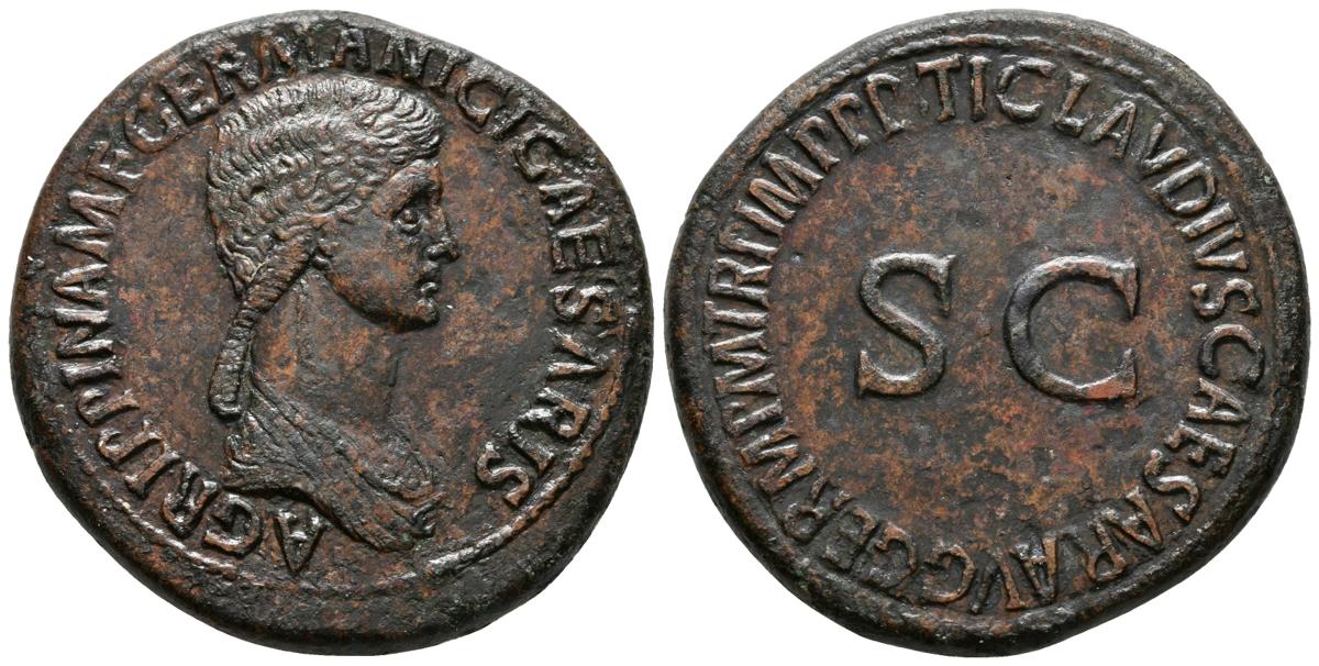AGRIPPINA I. Sestercio. 41-54 d.C. Roma. A/ Busto drapeado a derecha. AGRIPPINA M F GERMANICI CAESARIS. R/ S-C central y alrededor TI CLAVDIVS CAESAR AVG GERM P M TR P IMP P P. RIC 102 (Claudius). Ae. 30,27g. MBC+. Ex. Numismatik Naumann 49.