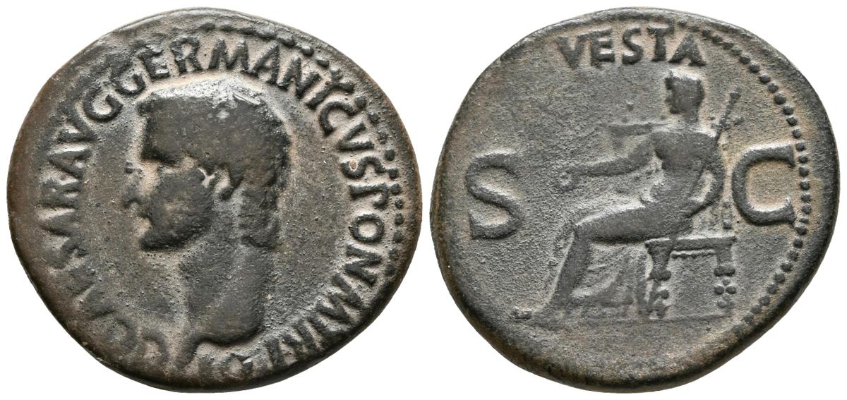 CALIGULA. As. 37-38 d.C. Roma. A/ Cabeza a izquierda. C CAESAR AVG GERMANICVS PON M TR POT. R/ Vesta sedente a izquierda portando cetro y pátera, sobre ella VESTA y en exergo S C. RIC 38. Ae. 10,88g. MBC.