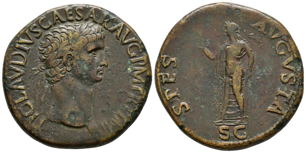 CLAUDIO. Sestercio. 41-50 a.C. Roma. A/ Busto laureado a derecha. TI CLAVDIVS CAESAR AVG P M TR P IMP. R/ Spes avanzando a izquierda sosteniendo vestido y portando flor. RIC 99; BMCRE 124. Ae. 25,51g. MBC+.