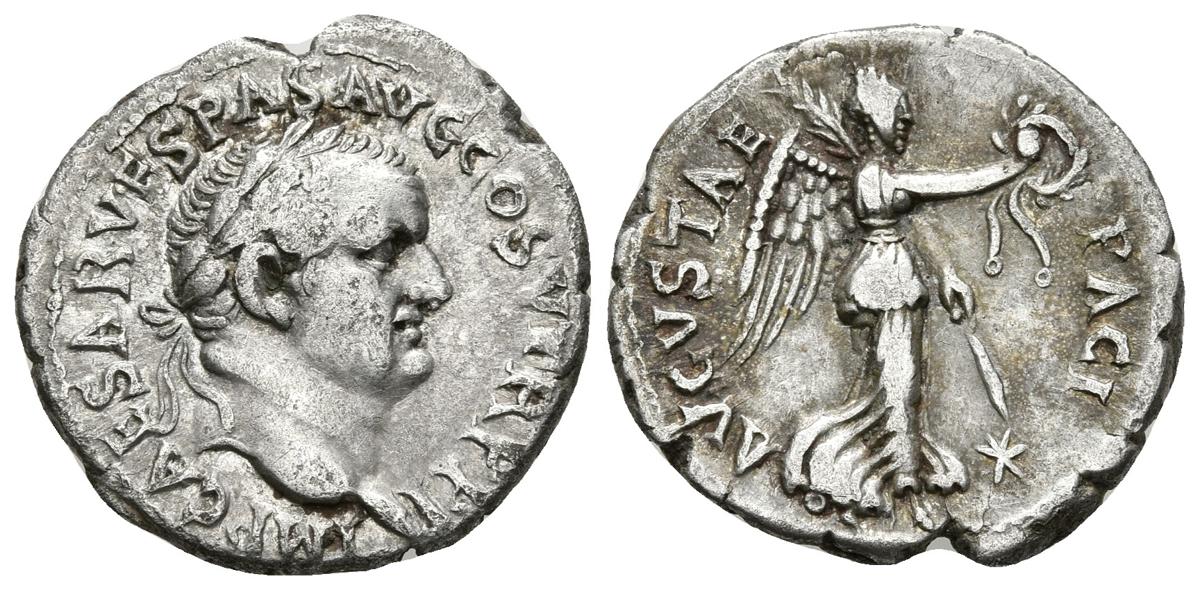 VESPASIANO. Denario. 74 a.C. Ephesos. A/ Busto laureado a derecha. IMP CAESAR VESPAS AVG COS V TR P P P. R/ Victoria a derecha sosteniendo corona y palma, estrella en la parte inferior derecha. PACI AVGVSTAE. RIC 1457; BMCRE 475; RPC II 853; RSC 277. Ar. 3,28g. MBC.
