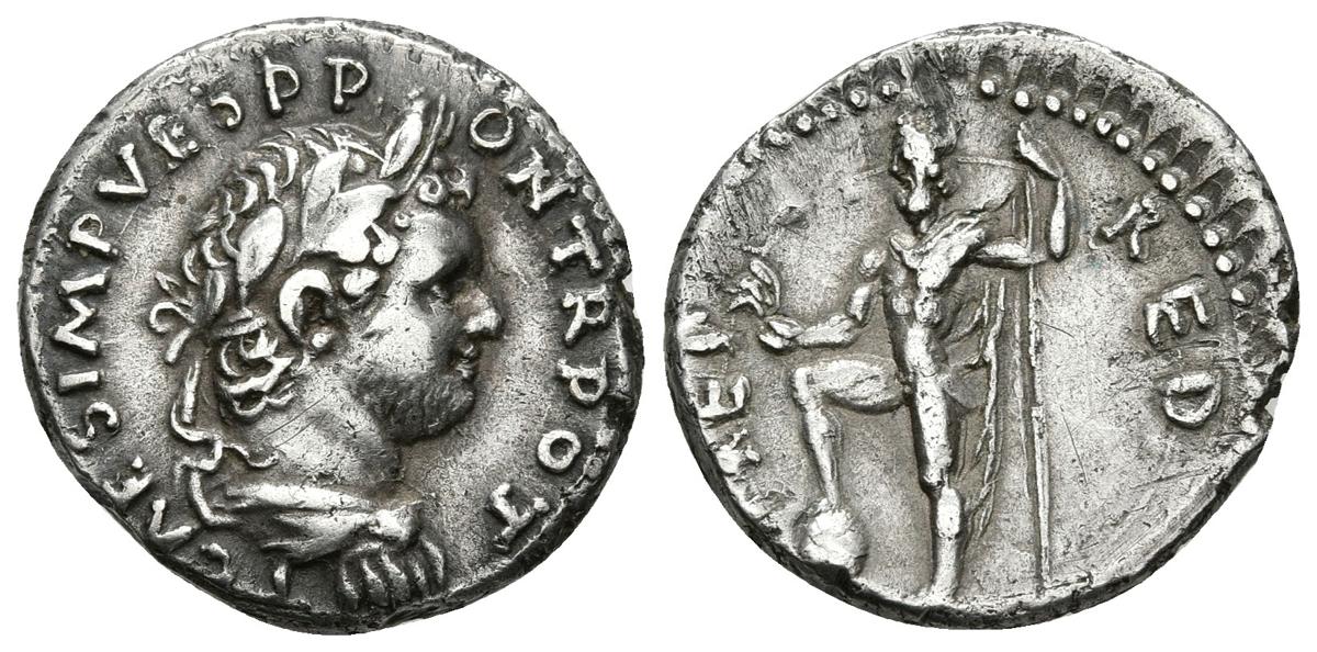 TITO. Denario. 72 a.C. Antioquía. A/ Busto laureado y drapeado con coraza a derecha. T CAES IMP VESP PON TR POT. R/ Neptuno estante a izquierda con pie sobre globo portando acrostolium y cetro. NEP RED. BMC 516; Cohen 122; RIC II 1561. Ar. 3,47g. MBC+. Escasa.