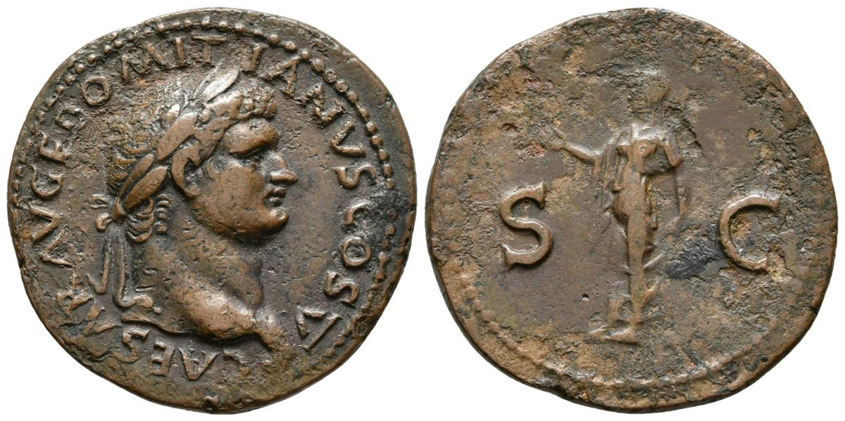 DOMICIANO. As. 69-81 d.C. Lugdunum. A/ Busto laureado a derecha. CAESAR AVG F DOMITIANVS COS V. R/ Spes avanzando a izquierda sosteniendo vestido y portando flor. RIC 1053. Ae. 10,64g. MBC+/MBC. Rara.