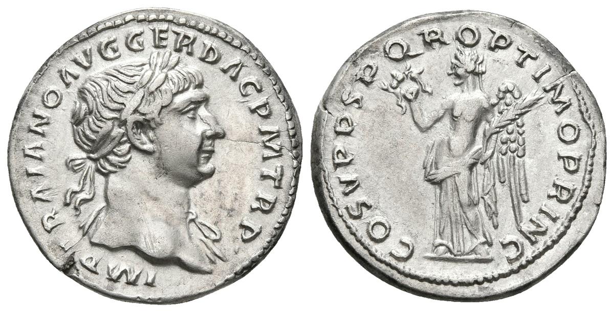 TRAJANO. Denario. 98-117 d.C. Roma. A/ Busto laureado y con ligero drapeado a derecha. IMP TRAIANO AVG GER DAC P M TR P. R/ Victoria a izquierda con palma y corona. COS V P P S P Q R OPTIMO PRINC. RIC 128; BMC 328; Cohen 75. Ar. 3,08g. EBC-.