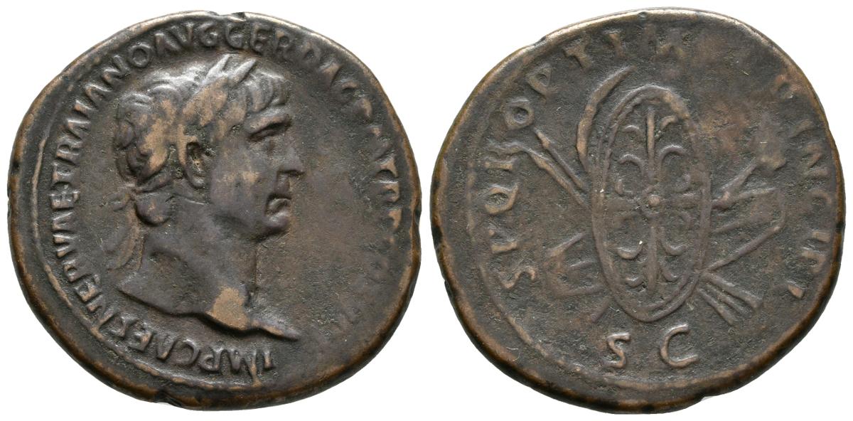 TRAJANO. As. 103-111 d.C. Roma. A/ Busto laureado a derecha. IMP CAES NER TRAIANO OPTIMO AVG GER DAC P M TR P COS VI P P. R/ Escudo ovalado decorao, detrás dos escudos con lanzas y vexillum. S P Q R OPTIMO PRINCIPI, en exergo S C. RIC II 584; BMCRE 949; Cohen 569. Ae. 10,51g. MBC. Escasa.