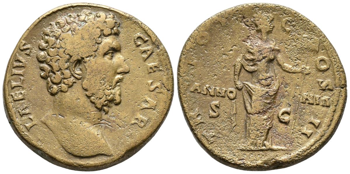 AELIO. Sestercio. 136-138 d.C. Roma. A/ Cabeza desnuda a derecha. L AELIVS CAESAR. R/ Pannonia estante a derecha sosteniendo vexillum y sujetando su vestido. TR POT COS II/PANNONIA S-C. RIC 1059var; Banti 1var; BMC 1921var. Ae. 28,20g. MBC-. Rara.
