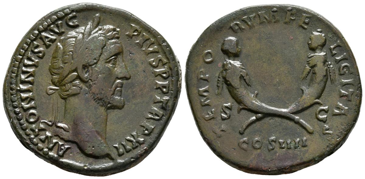 ANTONINO PIO. Sestercio. 138-161 d.C. Roma. A/ Busto laureado a derecha. ANTONINVS AVG PIVS P P TR P XII. R/ Dos cornucopias cruzadas con racimos de uvas y rematadas en cabezas de niños enfrentadas. TEMPORVM FELICITAS / S-C, en exergo COS IIII. RIC 857. Ae. 26,45g. MBC. Ex. H.D. Rauch Gmbh 79.