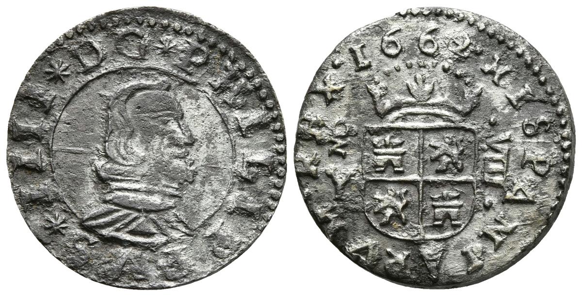 FELIPE IV. 8 Maravedís. 1662. Madrid Y. Punto entre REX y la fecha. Cal-1422; J.S. M-333. Ae. 2,70g. Conserva parte del plateado original. MBC/MBC+. Escasa.