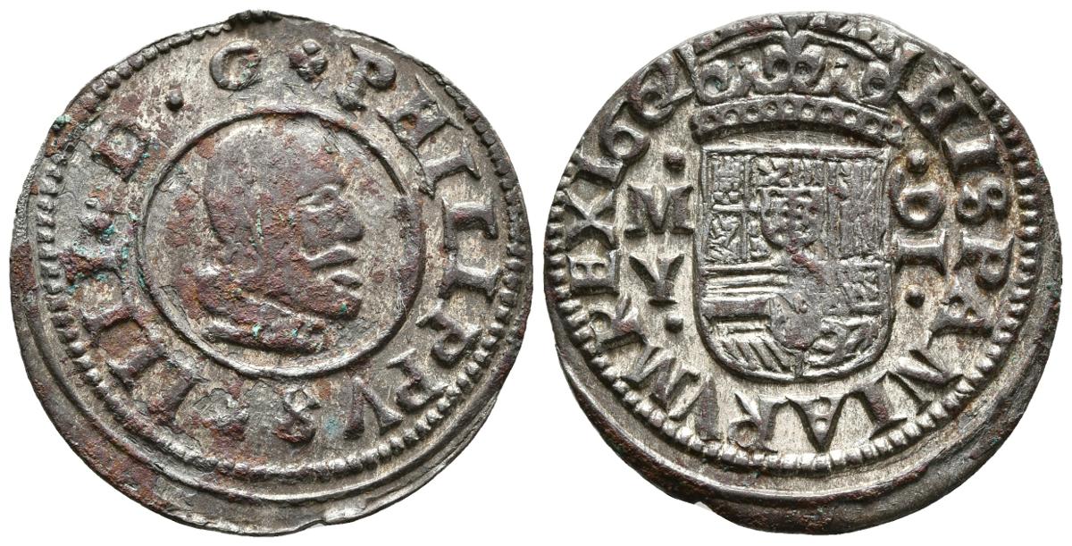 FELIPE IV. 16 Maravedís. 1662. Madrid Y. Cal-No cita; J.S. M-395. Ae. 4,31g. Conserva parte del plateado original. MBC+/EBC-. Muy rara.
