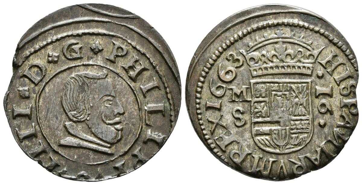 FELIPE IV. 16 Maravedís. 1663. Madrid S. N invertida en reverso. Cal-1399; J.S. M-377. Ae. 4,17g. Conserva parte del plateado original. EBC-/MBC+.