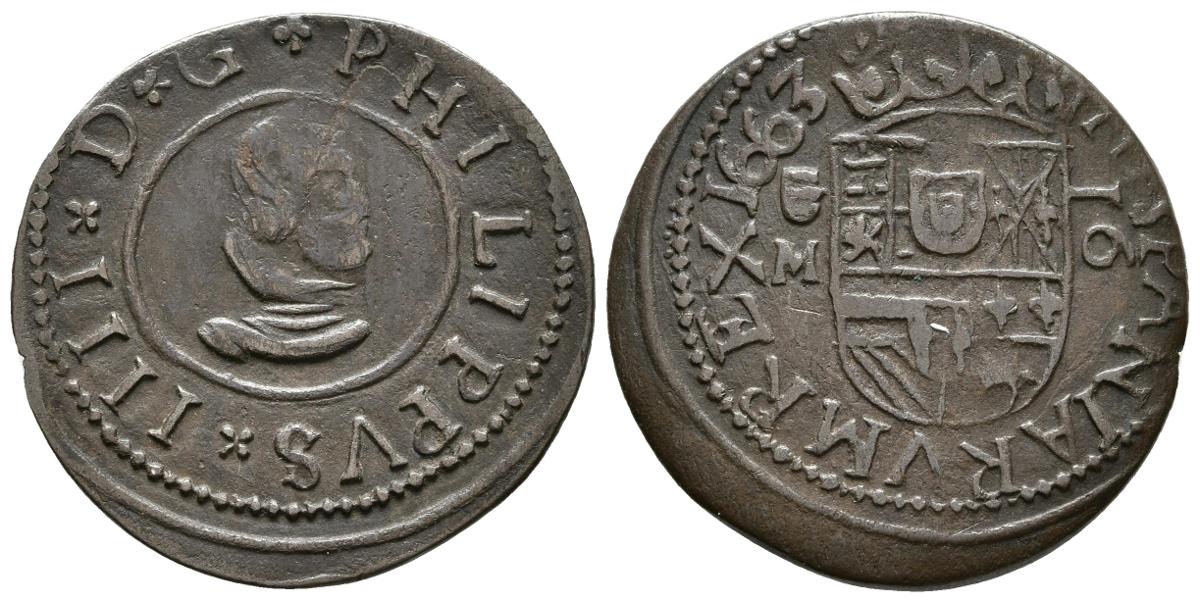 FELIPE IV. 16 Maravedís. 1663. Valladolid M. Cal-1672; J.S. M-817/18 var. Ae. 4,43g. MBC+.