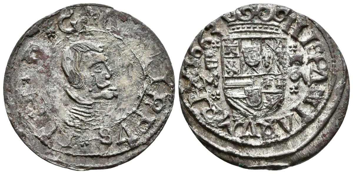 FELIPE IV. 16 Maravedís. 1663. Valladolid M. Jirones abiertos a derecha. Las A de HISPANIARVM son V invertidas. Cal-1672; J.S. M-831. Ae. 3,74g. Conserva todo el plateado original. Fallo de acuñación en anverso. BC+/MBC+. Rara.