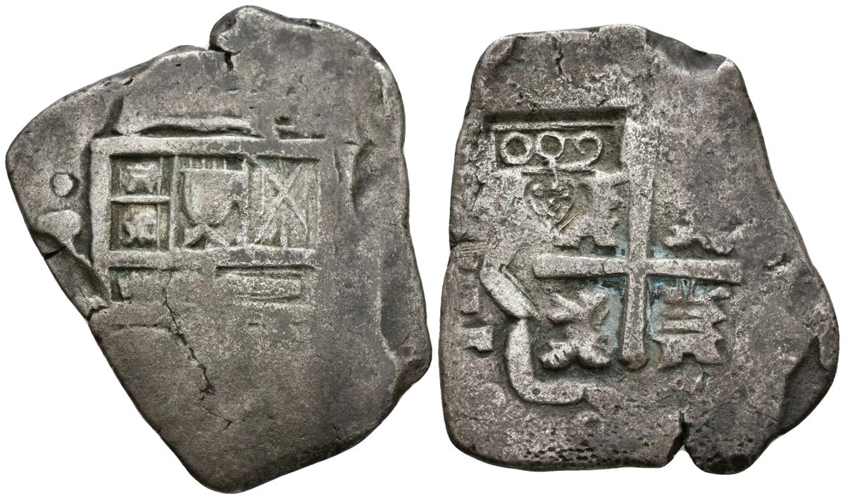 FELIPE IV. 8 Reales. S/D. Potosí. Curiosa falsa de época con contramarca (Auténtica) de 600 Reis en Cartela bajo corona (De Mey-1032), aplicada en 1663. Cal-472var. Ar. 24,80g. MBC. Muy rara.