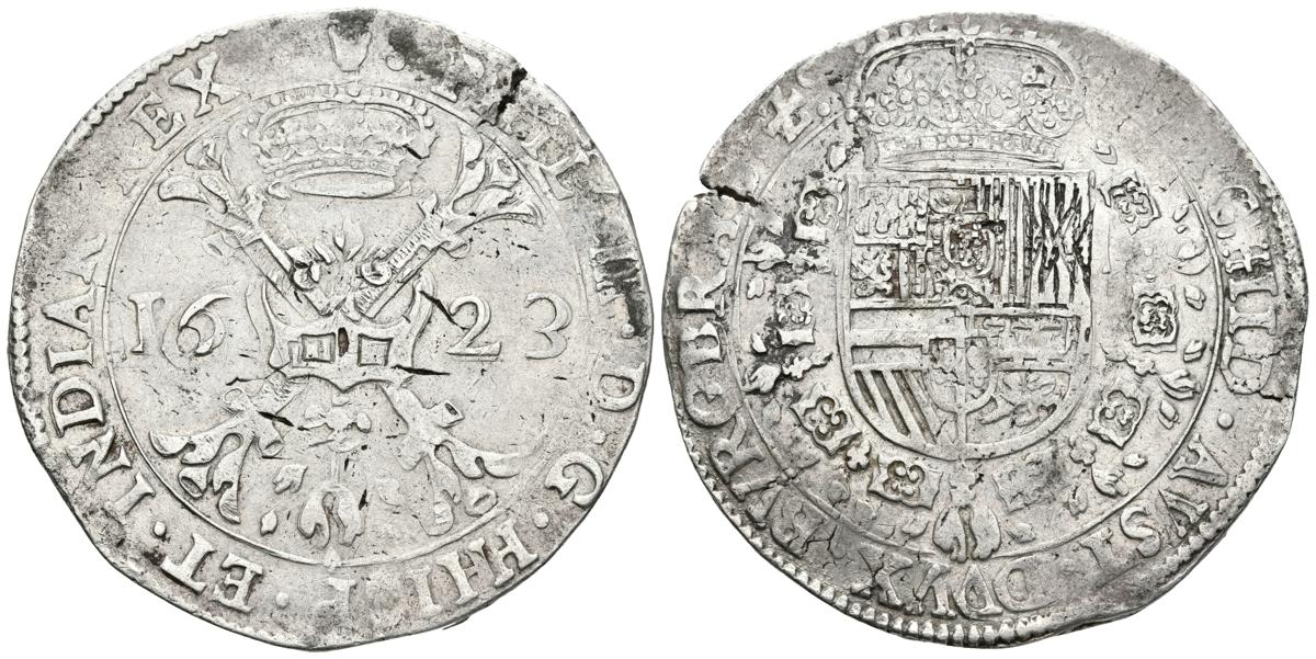 FELIPE IV. 1 Patagón. 1623. Amberes. Vti. 929; Vanhoudt 645.AN; Van Gelder & Hoc 329-1. Ar. 27,65g. MBC+.
