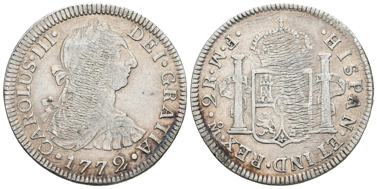 CARLOS III. 2 Reales. 1772. México FM. Ceca y ensayadores invertidos. Cal-1337. Ar. 6,55g. MBC-. Rara.