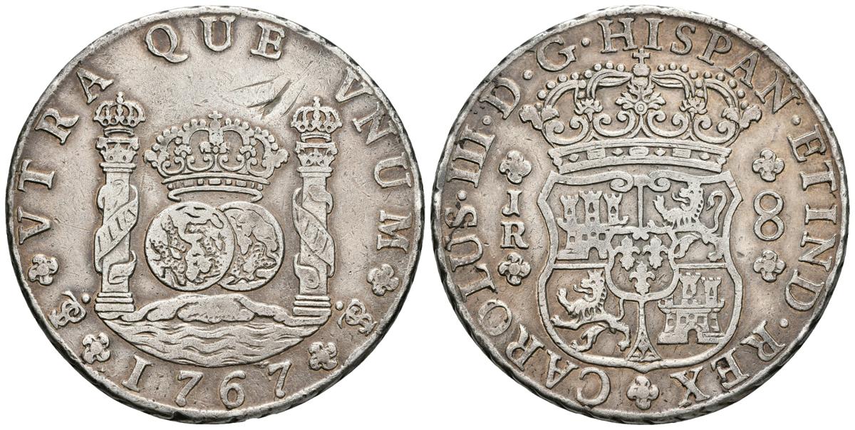 CARLOS III. 8 Reales. 1767. Potosí JR. Columnario. Punto después de CAROLUS. R/ Roseta de 4 pétalos. Cal-966. Ar. 26,66g. Rayas en anverso. MBC. Muy rara.