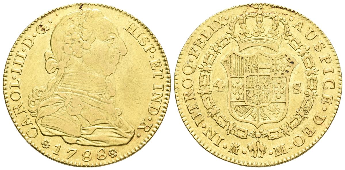 CARLOS III. 4 Escudos. 1788. Madrid M/PJ. Cal-315 var. Au. 13,47g. MBC-. Muy rara rectificación.
