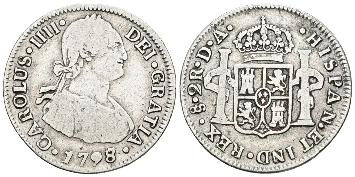 CARLOS IV. 2 Reales. 1798/7. Santiago DA. Cal-1045var. Ar. 6,46g. BC+/MBC-. Escasa.
