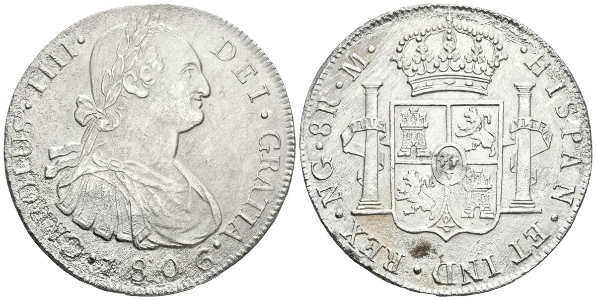 CARLOS IV. 8 Reales. 1806. Guatemala M. Cal-639. Ar. 25,81g. Oxidaciones marinas. MBC. Escasa.
