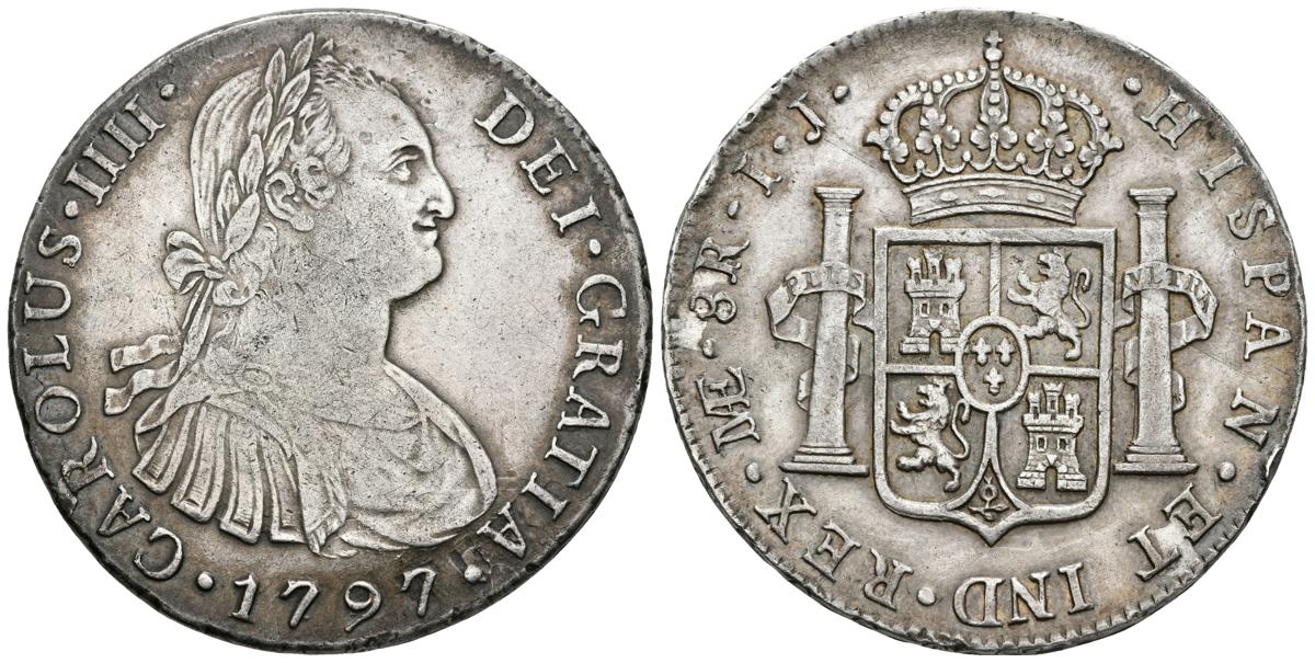 CARLOS IV. 8 Reales. 1797. Lima IJ. Cal-652. Ar. 27,11g. Reacuñada sobre otro real de a 8. Preciosa pátina. MBC+/EBC-.