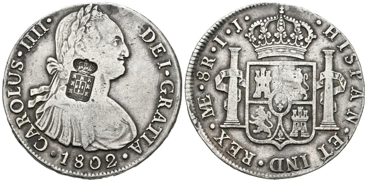 CARLOS IV. 8 Reales. 1802. Lima IJ. Resello escudo de Portugal (De Mey 1040). Cal-657. Ar. 26,69g. MBC. Rara.