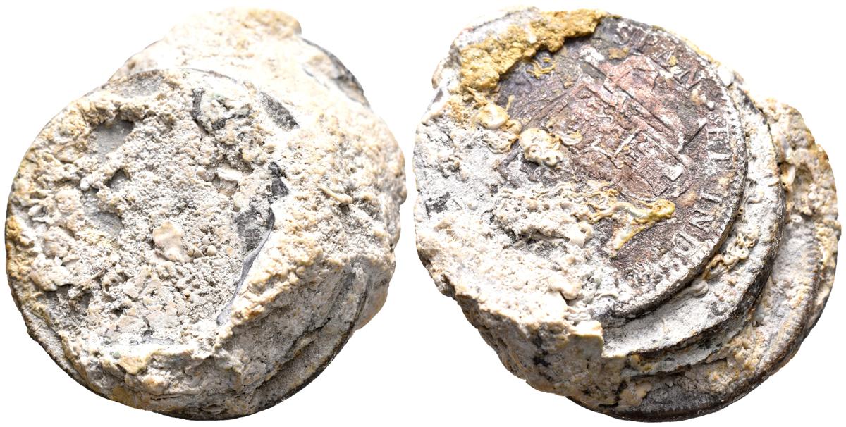 CARLOS IV. Interesante conglomerado con cinco reales de a 8 probablemente acuñados en Lima o México. Presenta concreciones marinas así como algunas conchas y restos de corales. Raro.
