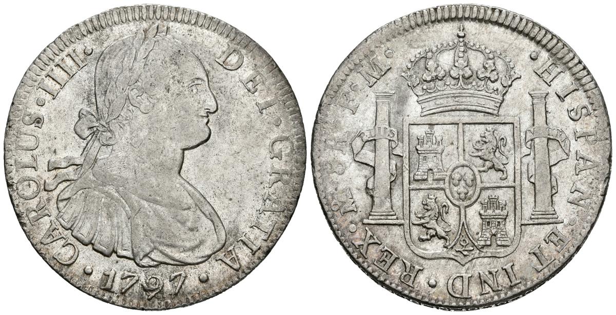 CARLOS IV. 8 Reales. 1797. México FM. Cal-691. Ar. 26,93g. Brillo original. MBC+.