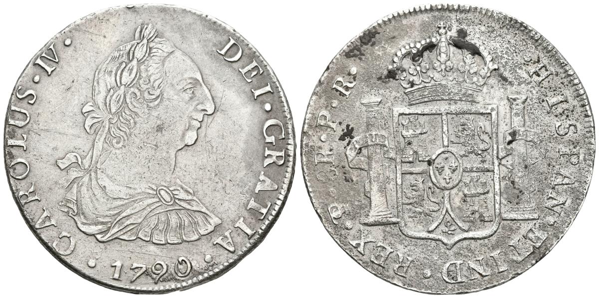 CARLOS IV. 8 Reales. 1790. Potosí PR. Busto de Carlos III y ordinal IV. Cal-711. Ar. 26,68g. Tipo flan grande y erosiones en reverso. MBC+/MBC. Escasa.
